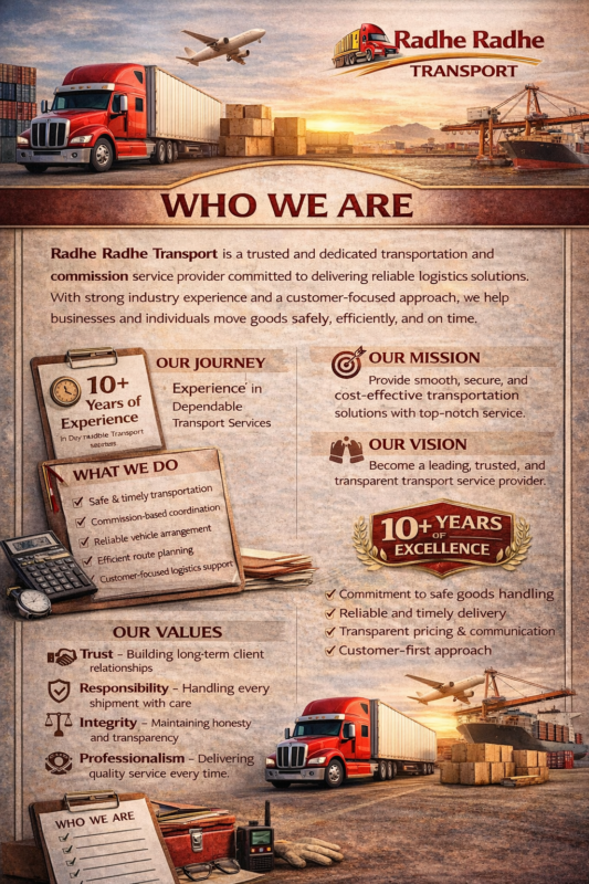 Radhe Radhe Transport is a trusted and dedicated transportation and commission service provider committed to delivering reliable logistics solutions. With strong industry experience and a customer-focused approach, we help businesses and individuals move goods safely, efficiently, and on time.